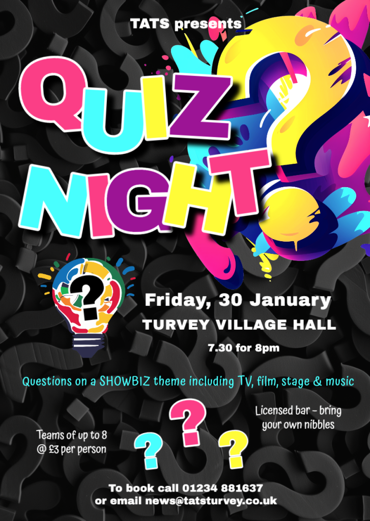 The ever popular annual show biz quiz takes place on Friday 30th January 2026 in Turvey Village Hall.